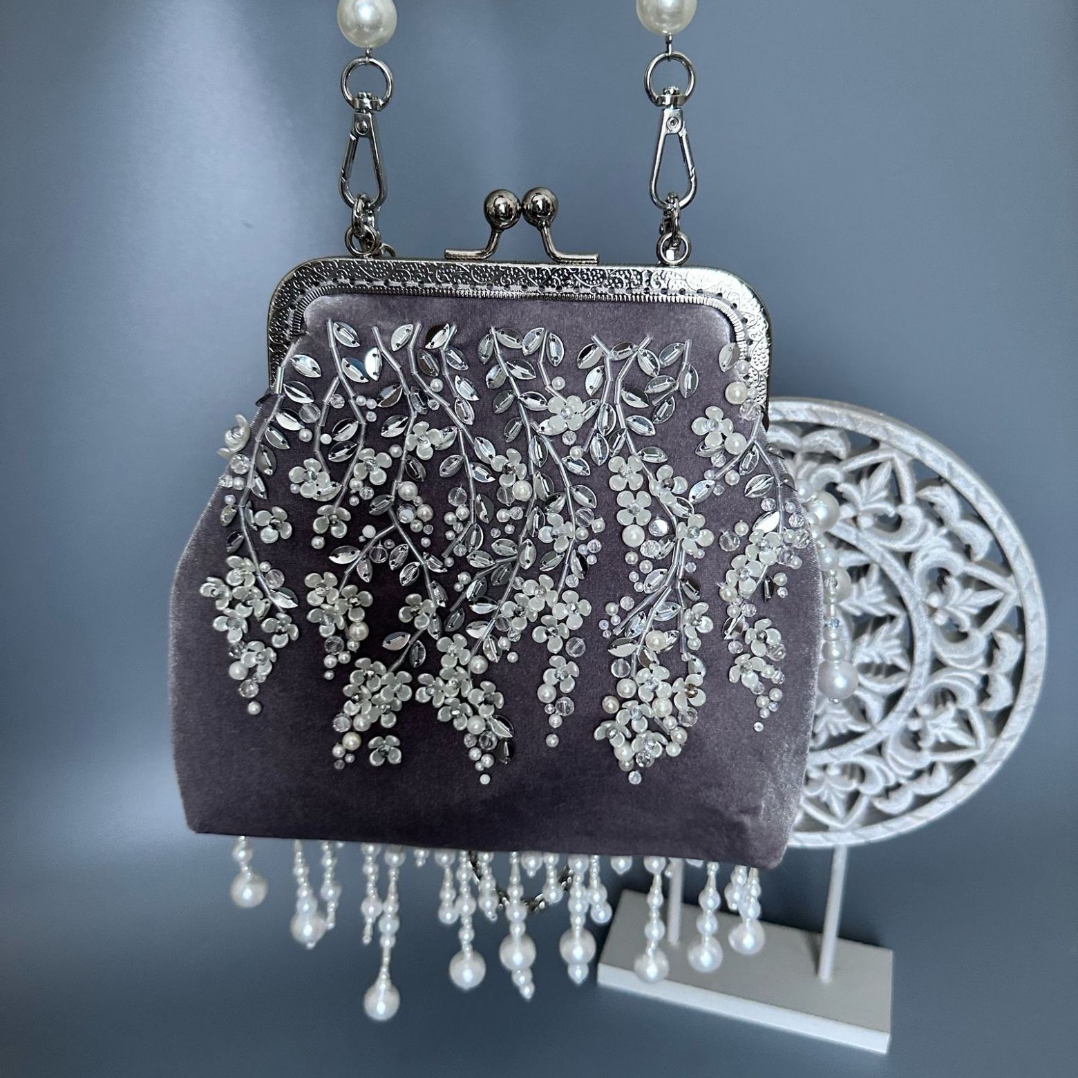 Женская сумка ручной работы "Lilac" из серого бархата с ручной вышивкой и фермуаром