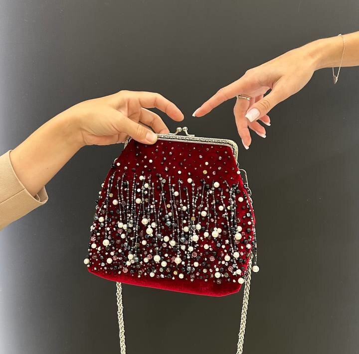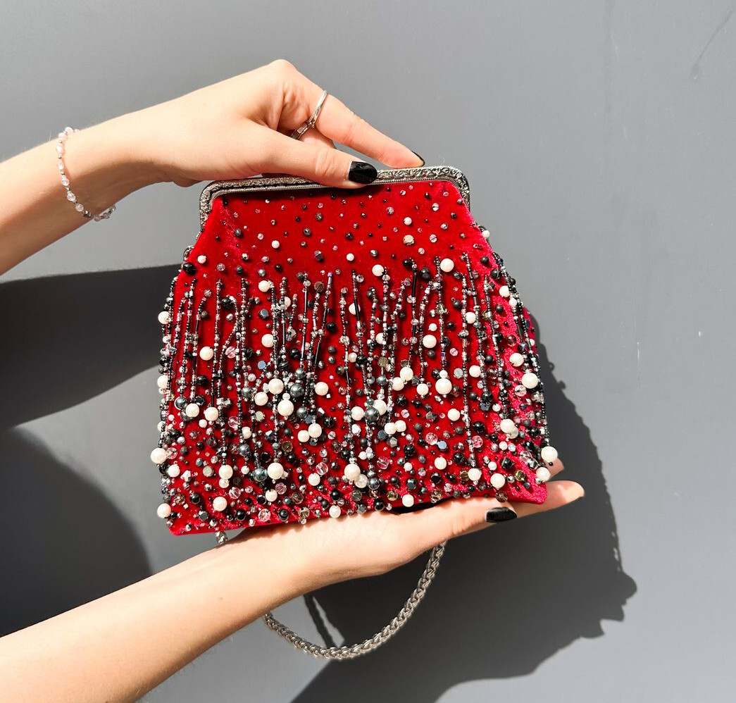 Женская сумка ручной работы "Chicago" из красного бархата с ручной вышивкой, бахрамой с фермуаром