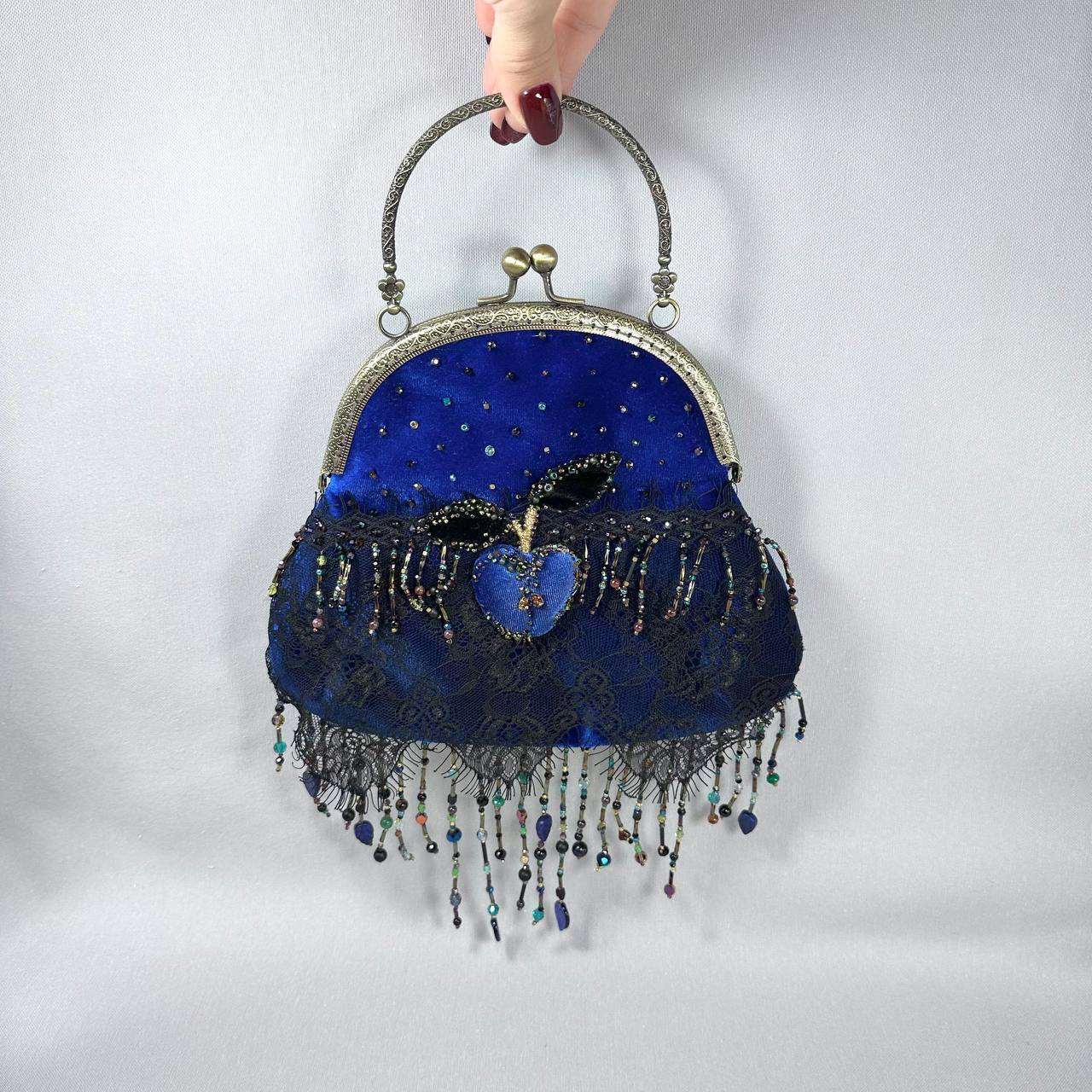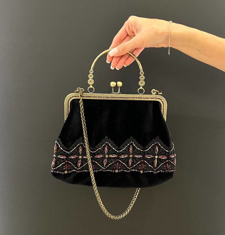 Женская сумка ручной работы "Premiere" из черного бархата с фермуаром и ручной вышивкой