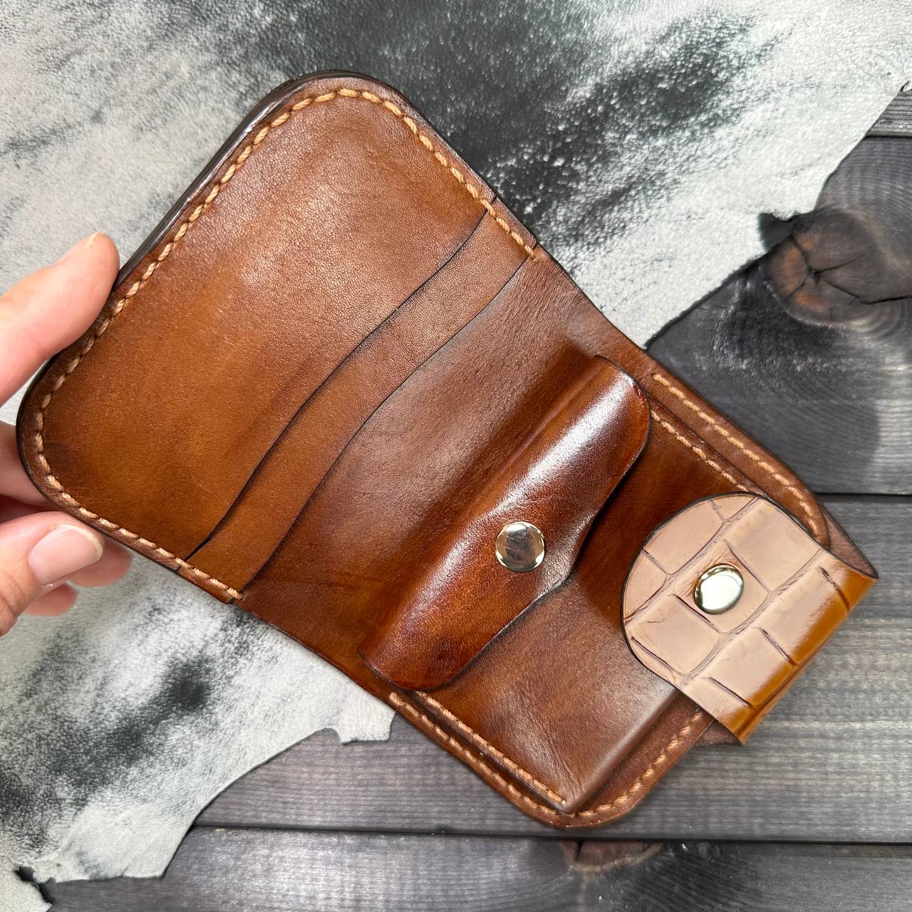 Стильная модель портмоне из стильной коричневой лакированной кожи с текстурой под аллигатора это выбор уверенной и стильной женщины. Портмоне «Style.Passion» станет яркой деталью вашего образа. Выразительная фактура в сочетании с боготым коричневым цветом и тактильная кожа дарит вам радость и наслаждение каждый день. Модель имеет вертикальную узкую, компактную форму и при этом вместительная. В портмоне имеется отделение для монет, которое закрывается на кнопку, 2 отделения для карт/визиток и одно отделение для купюр, которое удобно вмещает в себя рубли, доллары и евро. Изделие сшито в ручную из коричневой, лакированной натуральной кожи особой выделки под аллигатора. Внутренние карманы и монетница сшиты из гладкой натуральной кожи, окрашенной вручную итальянской краской, что делает данную модель портмоне уникальной. Кошелёк закрывается на хлястик с кнопкой. Портмоне сшито из натуральной кожи КРС белорусского производства. Ручной шов, выполненный прочной вощенной ниткой толщиной 0.8 мм, что придает изделию красоты и стиля, гарантирует долговечность и надежность. Урезы (края) тщательно обработаны средствами премиум-класса от итальянского бренда Kenda Farben для обработки урезов, что предотвращает расслоение кожи и увеличивает срок службы изделия. Для окрашивания используется итальянская экологически чистая краска, обеспечивающая насыщенный цвет и безопасность. Каждое наше изделие проходит финишную обработку средствами премиум-класса от итальянского бренда Kenda Farben, ведущего производителя продукции для кожевников. Это обеспечивает защиту кожи от внешних воздействий, придает ей мягкость и подчеркивает естественную красоту. Это стильное и уникальное портмоне – идеальный выбор для тех, кто ценит качество, функциональность и внимание к деталям. Станет отличным подарком для ценителей ручной работы и натуральной кожи! Подчеркните свой индивидуальный стиль с этим эксклюзивным аксессуаром. Размер кошелька в закрытом виде: 90*115*30 мм. «Style.Passion» - это модель для той, которая ценит: стиль, утонченность, надёжность, красоту, практичность и следит за трендами. Для данной коллекции, мы подобрали качественную белорусскую кожу КРС с гладкой поверхностью и лакированную с текстурой под аллигатора. Аксессуары коллекции «Passion» - это стиль, утонченность , красота, надёжность и практичный дизайн.