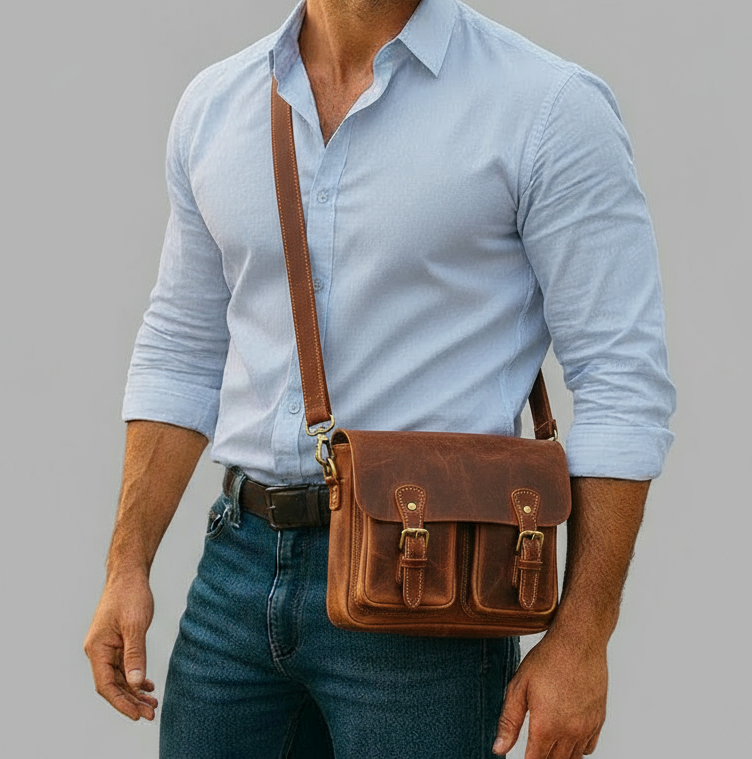 Мужская наплечная черная сумка ручной работы "Buffalo" из натуральной кожи (КРС) черного цвета, ручной шов