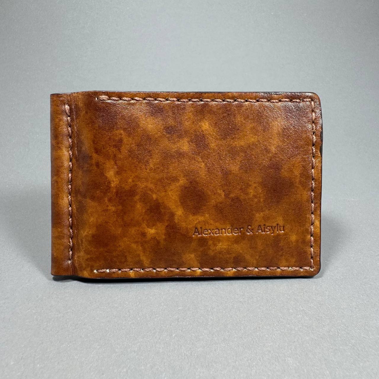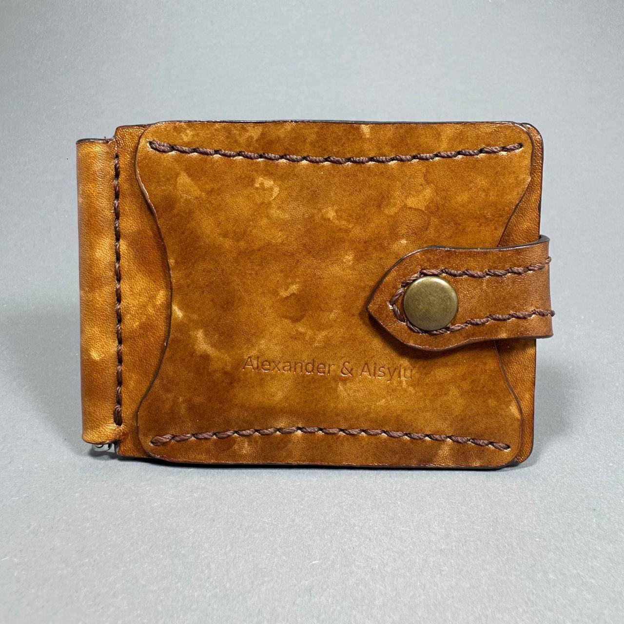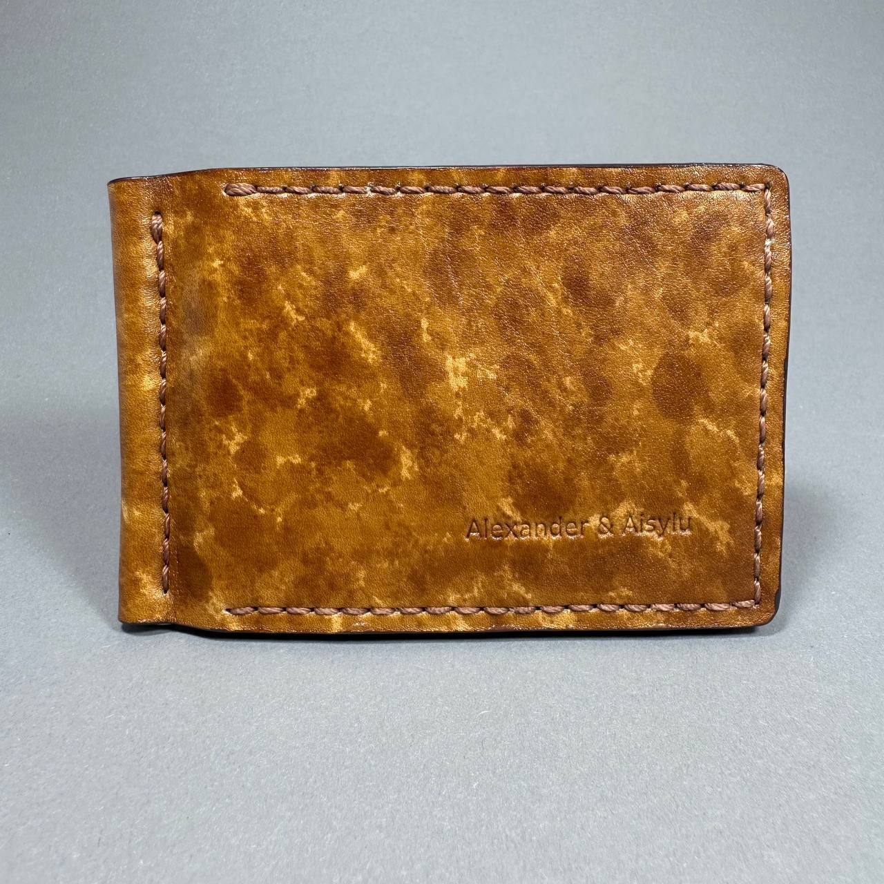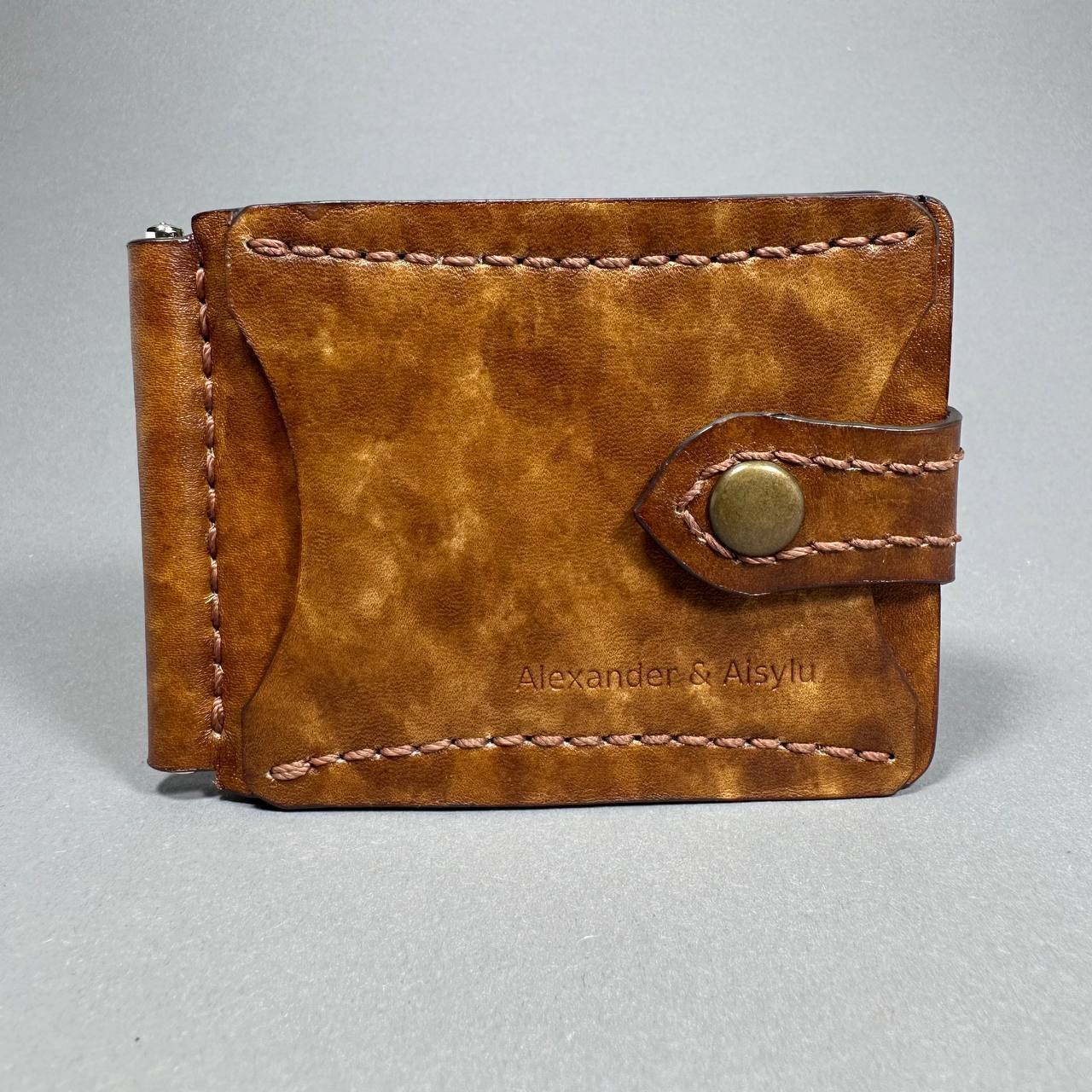 Мужской зажим для денег коричневый "Presidio. Max 1" из натуральной кожи (КРС) ручной работы, ручной шов